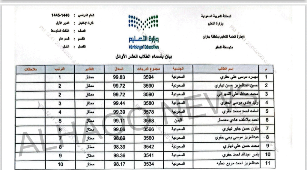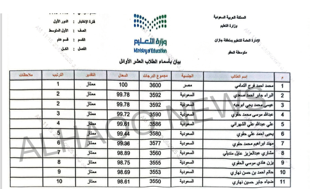 أعلنت مدرسة الحقو المتوسطة والثانوية أسماء العشرة الأوائل من طلاب المرحلة المتوسطة والصف الثاني الثانوي، في ختام الفصل الدراسي، وسط أجواء من الفخر والاعتزاز بالنجاحات المتحققة.