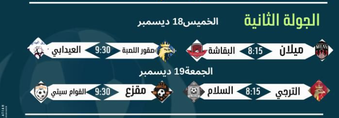 ومع حلول اليوم الثلاثاء 16 ديسمبر، تتجه أنظار المتابعين إلى الجولة الثانية التي تنطلق مساء الخميس 18 ديسمبر، حيث يلتقي ميلان مع البقاشة عند الساعة 8:15 مساءً، في مواجهة تعويضية لكلا الفريقين، فيما يواجه صقور اللصبة فريق العيـدابي عند الساعة 9:30 مساءً في لقاء يُنتظر أن يكون مفصليًا في سباق التأهل عن المجموعة.