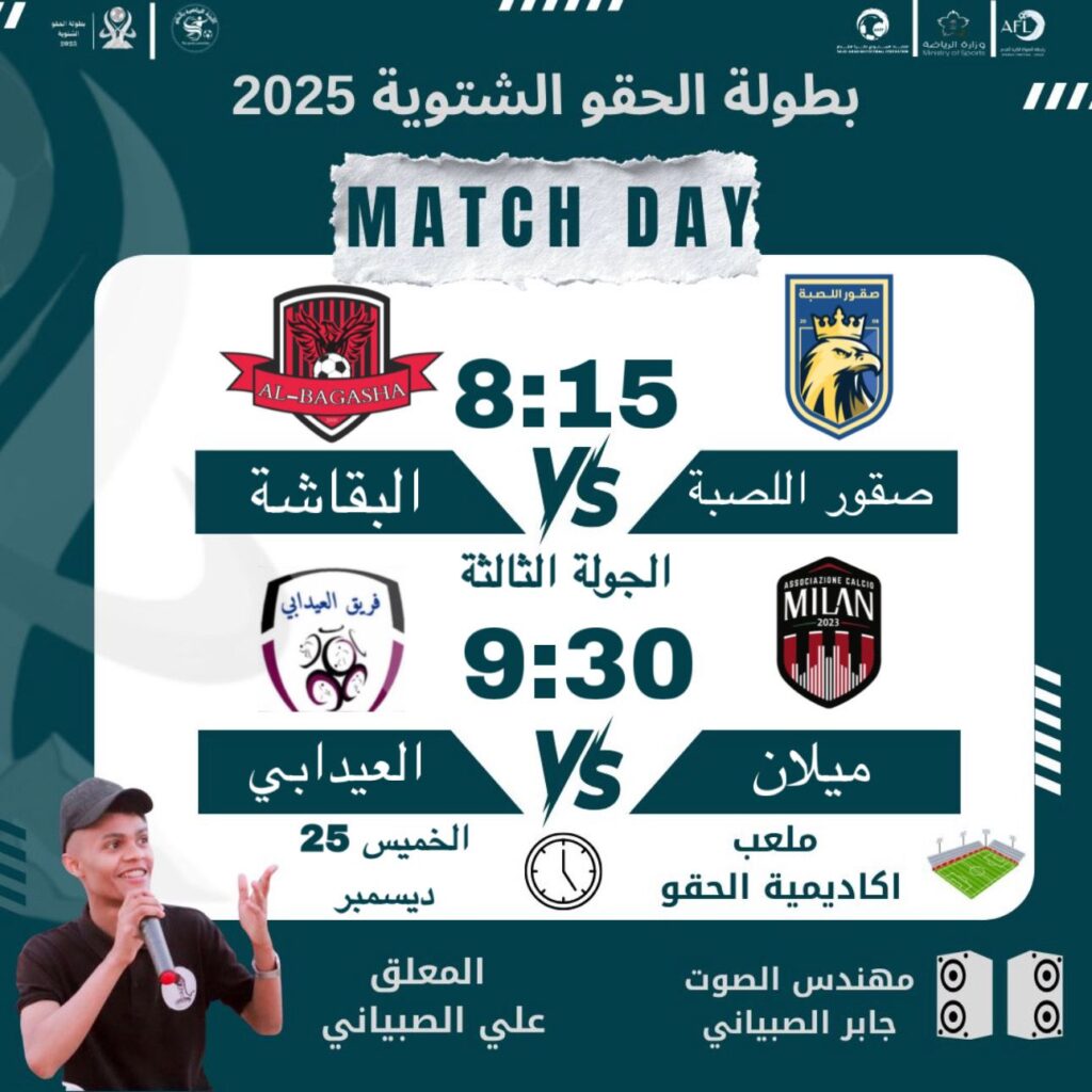 الجولة الثالثة تفتح حسابات معقّدة الليلة في بطولة الحقو الشتوية 2025.. البقاشة أمام اختبار صقور اللصبة وميلان في مواجهة العيدابي