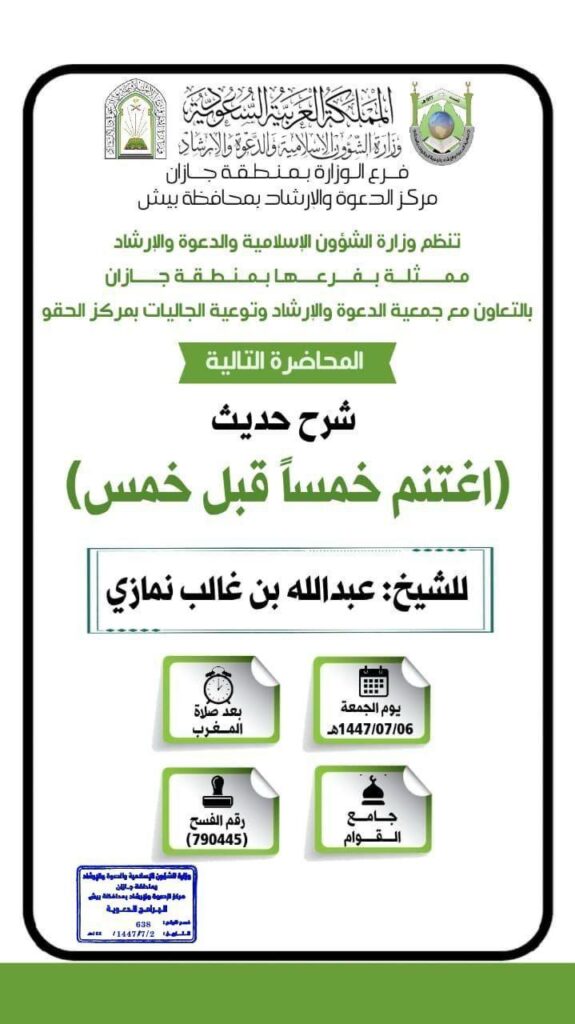 ينظّم فرع وزارة الشؤون الإسلامية والدعوة والإرشاد بمنطقة جازان، ممثلًا في مركز الدعوة والإرشاد بمحافظة بيش، غدًا الجمعة، محاضرة دعوية بعنوان «شرح حديث: اغتنم خمسًا قبل خمس»، وذلك ضمن البرامج الدعوية التي تنفذها الوزارة في المنطقة.
