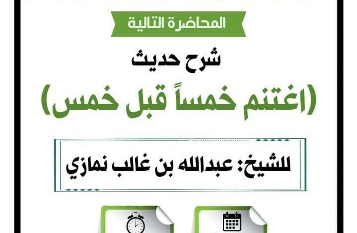 وسيلقي المحاضرة فضيلة الشيخ عبدالله بن غالب نمازي، حيث سيتناول شرح الحديث النبوي الشريف وما يحمله من معانٍ عظيمة تحث على استثمار العمر، واغتنام أوقات الفراغ، والصحة، والشباب، والحياة قبل حلول ما يشغل الإنسان عنها.