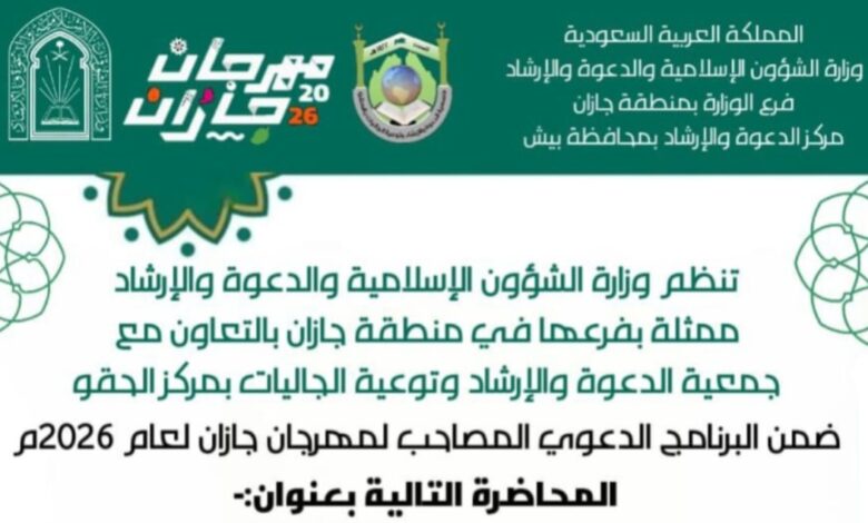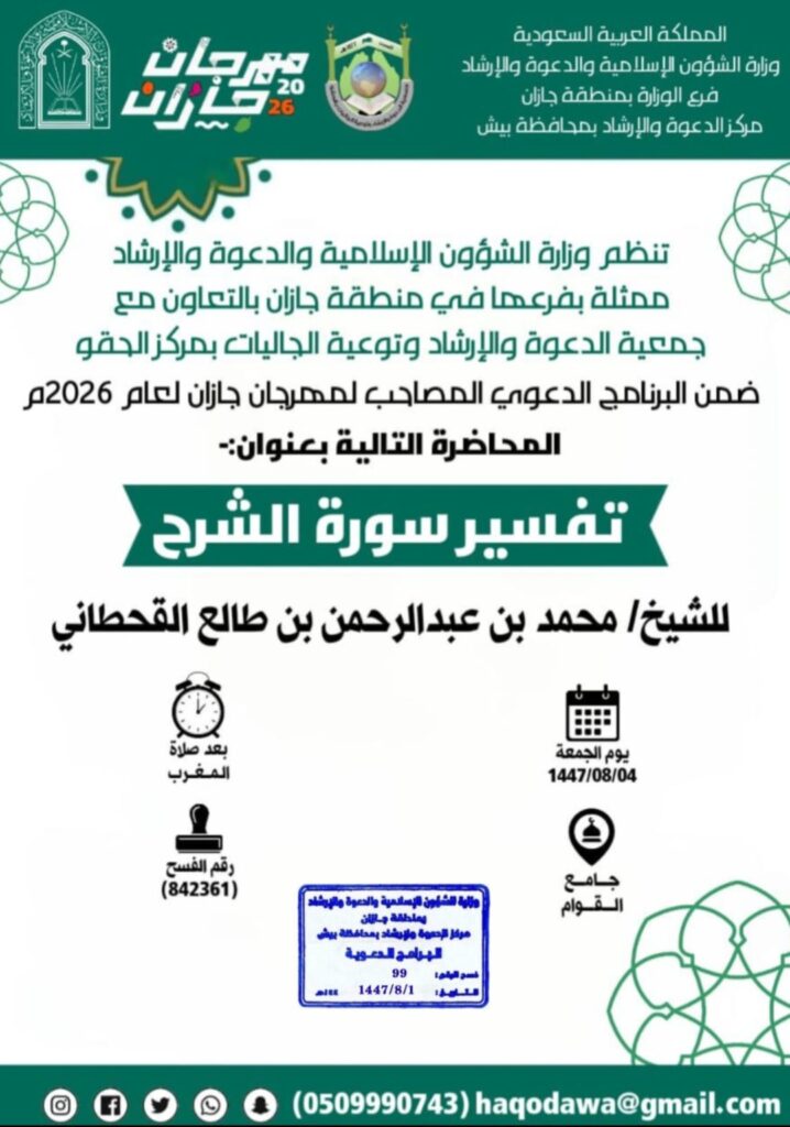 تنظم وزارة الشؤون الإسلامية والدعوة والإرشاد ممثلةً بفرعها في منطقة جازان، وبالتعاون مع جمعية الدعوة والإرشاد وتوعية الجاليات بمركز الحقو، محاضرة دعوية بعنوان “تفسير سورة الشرح”، وذلك ضمن البرنامج الدعوي المصاحب لمهرجان جازان لعام 2026م.