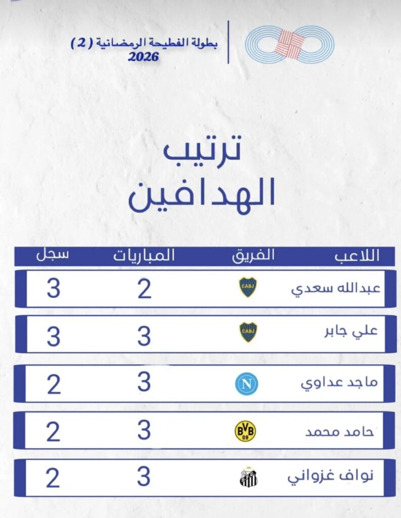 واصلت بطولة الفطيحة الرمضانية الثانية 2026 إثارتها الكبيرة بختام الجولة الثالثة التي شهدت مواجهة هجومية نارية، حيث أمطر فريق البوكا شباك سانتوس بأربعة أهداف مقابل هدفين على ملعب القائم.