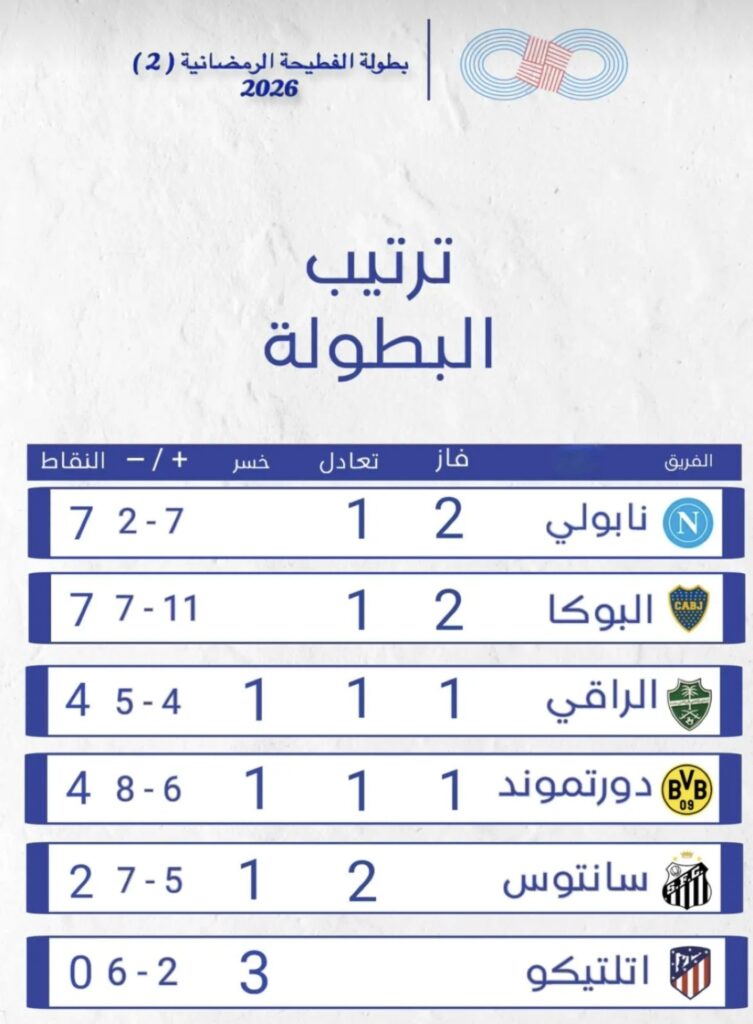 صراع القمة يشتعل في بطولة الفطيحة الرمضانية.. البوكا يضرب سانتوس برباعية.. ونابولي والبوكا يتقاسمان الصدارة قبل مواجهة الراقي