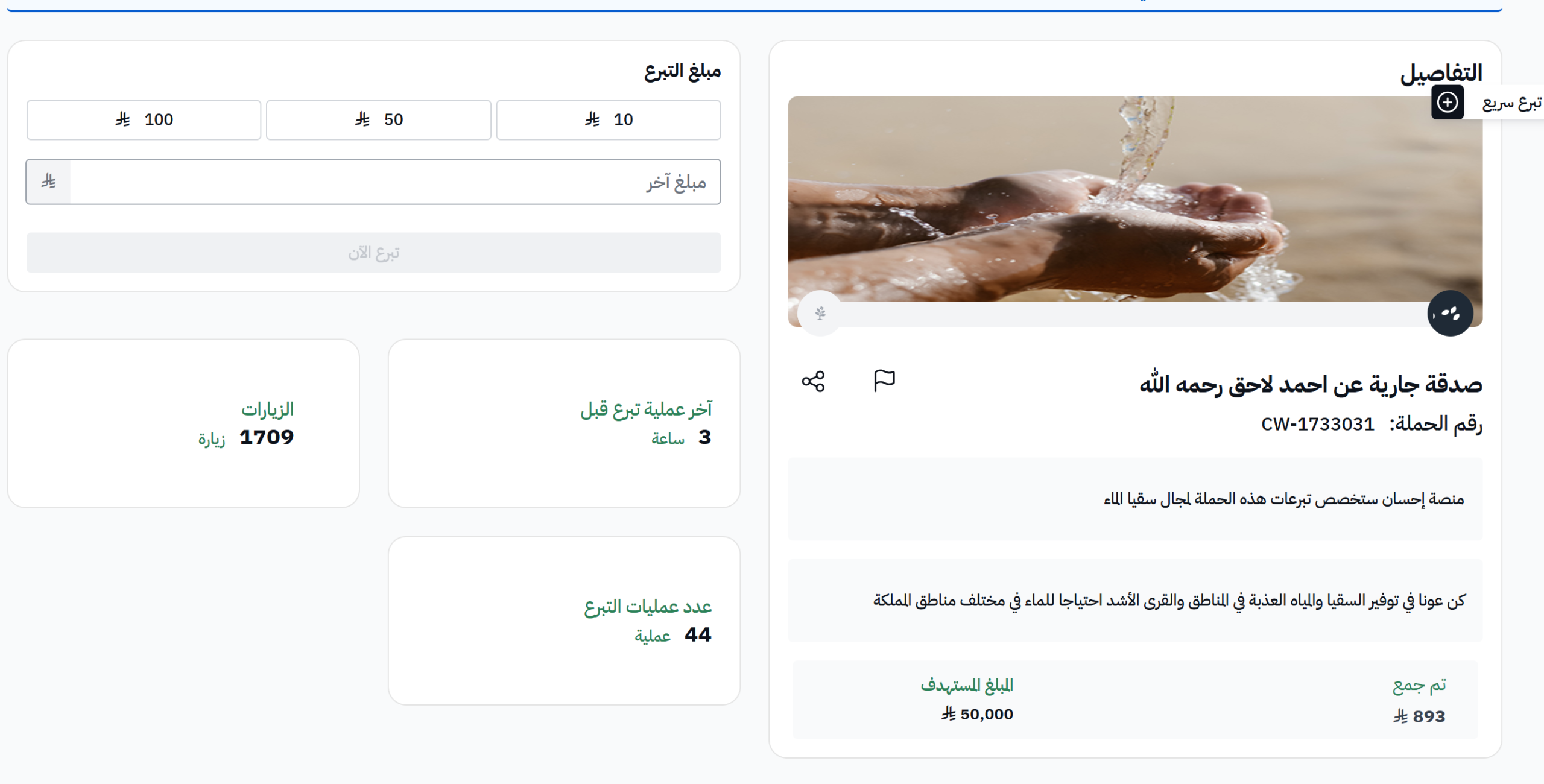 وبحسب ما يظهر في بيانات الحملة، فقد خُصصت التبرعات لمسار سقيا الماء، وهو أحد أوجه الخير التي تمس حاجة الناس بشكل مباشر.