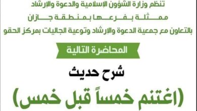 غداً .. فرع الشؤون الإسلامية بجازان ينظّم محاضرة دعوية بـــ “مركز الحقو”
