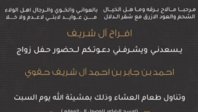 يتشرّف الأستاذ محمد بن أحمد محمد نهاري، والأستاذ أحمد بن علي موسى شاوش، بدعوتكم لحضور حفل زواج الشاب نزار بن…