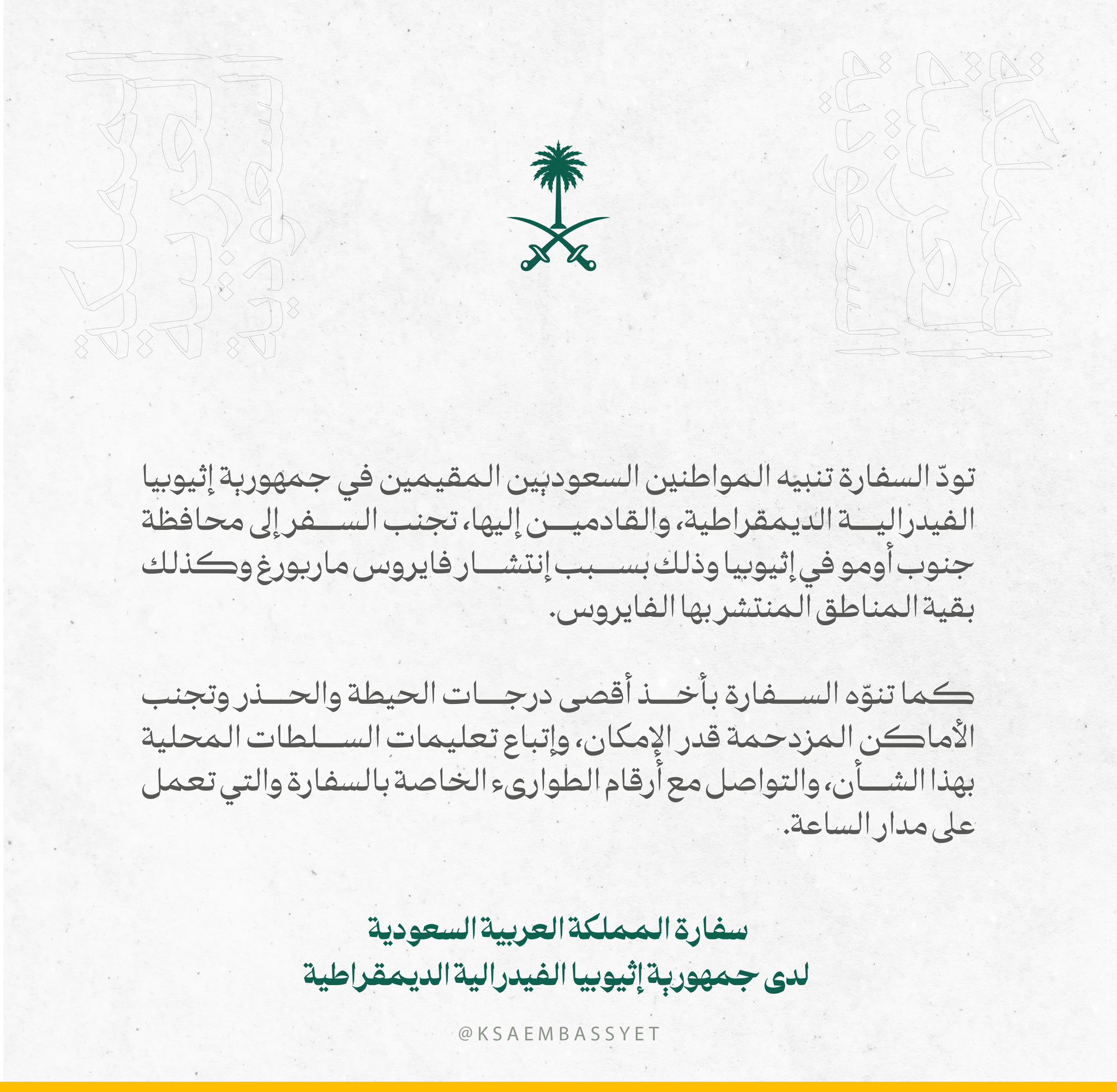 نبهت السفارة السعودية لدى إثيوبيا، المواطنين السعوديين المقيمين في إثيوبيا، والقادمين إليها، تجنب السفر إلى محافظة جنوب أومو، وذلك بسبب انتشار فيروس ماربورغ وكذلك بقية المناطق المنتشر بها الفيروس