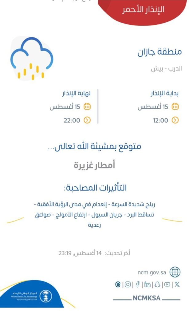 أصدر المركز الوطني للأرصاد تنبيهًا متقدمًا بالإنذار الأحمر يشمل محافظتي الدرب وبيش في منطقة جازان، حيث يُتوقع – بمشيئة الله – هطول أمطار غزيرة تبدأ من الساعة 12:00 ظهرًا وحتى 10:00 مساءً من يوم الجمعة 15 أغسطس 2025. وأوضح المركز أن الحالة الجوية قد تترافق مع رياح شديدة السرعة، وانعدام في مدى الرؤية الأفقية، وتساقط البرد، وجريان السيول، وارتفاع الأمواج، إضافةً إلى الصواعق الرعدية. ودعا المركز الجميع إلى أخذ الحيطة والحذر واتباع تعليمات الدفاع المدني والجهات المعنية لضمان السلامة