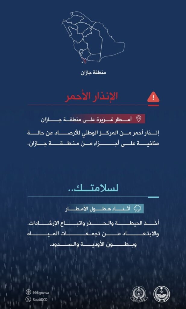عاجل .. الدفاع المدني يحذر: إنذار أحمر بأمطار غزيرة على جازان وتحذيرات من السيول