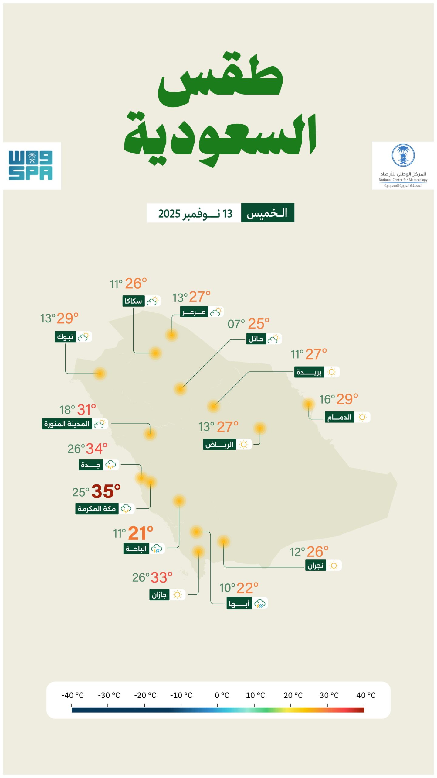 ودعا المركز المواطنين والمقيمين إلى أخذ الحيطة واتباع تعليمات السلامة، خصوصًا في الطرق السريعة والأودية التي قد تشهد جريانًا للمياه نتيجة الأمطار الرعدية.