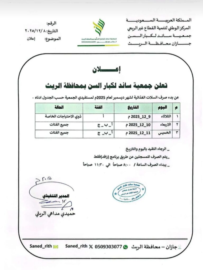 أعلنت جمعية ساند لكبار السن بمحافظة الريث أن صرف السلال الغذائية لشهر ديسمبر لعام 2025 سيبدأ يوم غدٍ الثلاثاء 9 ديسمبر، وذلك وفق الجدول المعتمد الذي يستمر حتى يوم الخميس 11 ديسمبر.