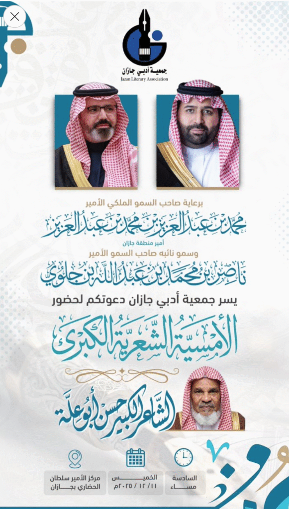 برعاية أمير جازان ونائبه … أمسية شعرية كبرى تحييها قامة الشعر العربي “حسن أبو علة” غدًا
