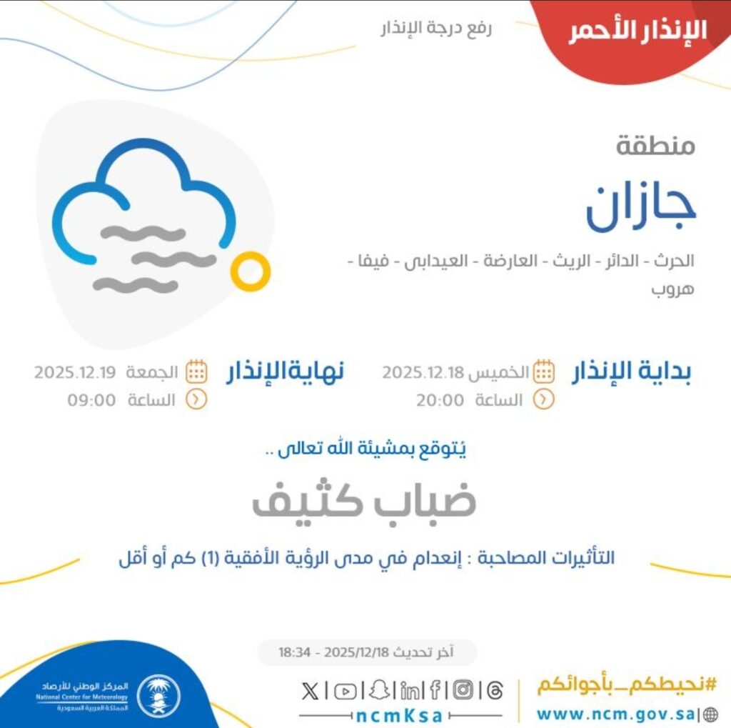 رفع المركز الوطني للأرصاد درجة الإنذار إلى اللون الأحمر على منطقة جازان، متوقعًا تشكّل ضباب كثيف يؤدي إلى انعدام أو شبه انعدام في مدى الرؤية الأفقية (1 كم أو أقل).