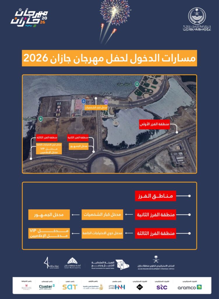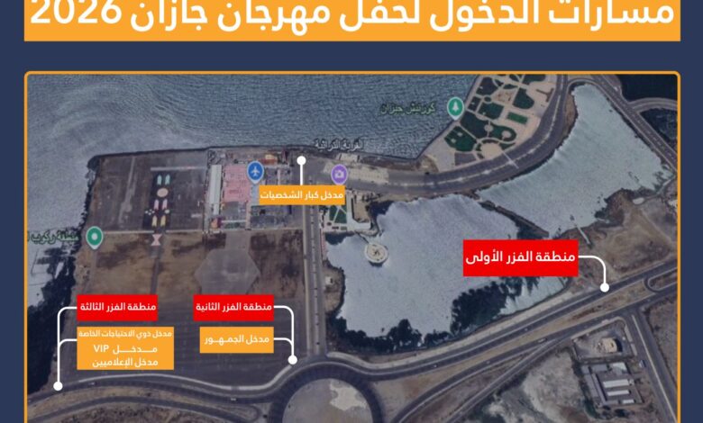 شاهد خريطة إرشادية توضّح مسارات الدخول ومناطق الفرز لحفل مهرجان جازان 2026