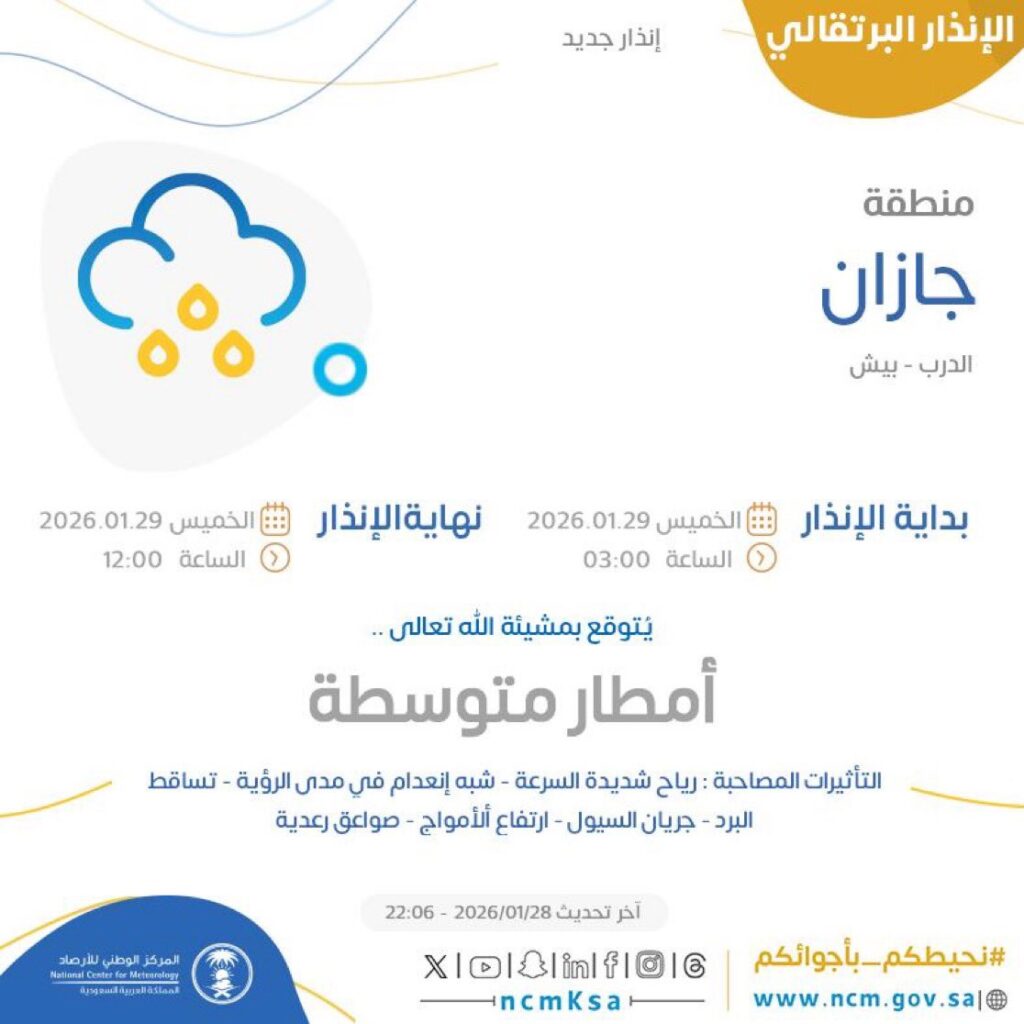 أصدر المركز الوطني للأرصاد إنذارًا برتقاليًا جديدًا على منطقة جازان، يشمل محافظتي الدرب وبيش، وذلك اعتبارًا من فجر يوم الخميس 29 يناير 2026م، وحتى الساعة 12:00 ظهرًا من اليوم نفسه.