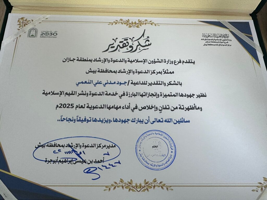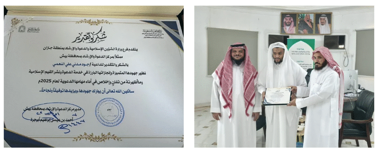 ويأتي هذا التكريم ضمن حرص مركز الدعوة بمحافظة بيش على دعم الدعاة والداعيات، وتحفيزهم على مواصلة العطاء، وتعزيز دورهم الريادي في الدعوة إلى الله، بما يسهم في ترسيخ المنهج الوسطي، وخدمة الدين والمجتمع.