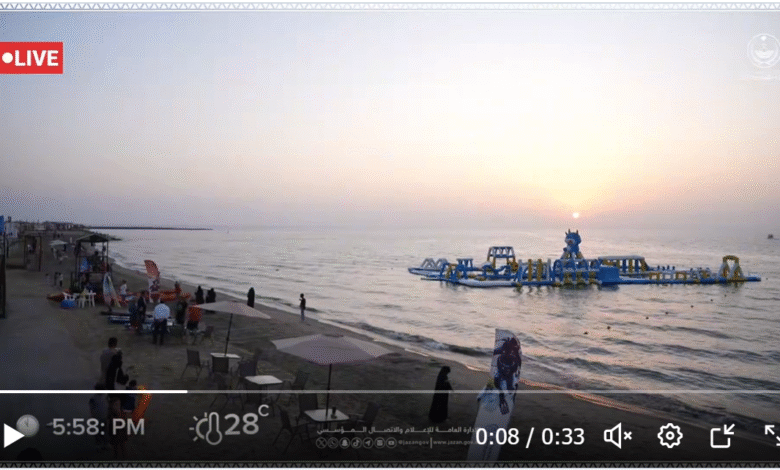 وأظهر البث المباشر توافد الزوار إلى الشاطئ للاستمتاع بالأجواء المعتدلة، فيما بدت الألعاب المائية العائمة قبالة الساحل كأحد أبرز عناصر الجذب السياحي بالموقع، في مشهد يعكس تنامي الاهتمام بالمواقع الترفيهية والواجهات البحرية بالمنطقة.