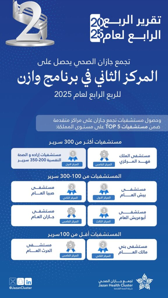 “مستشفى بيش” و”مجمع إرادة” يتصدران المملكة بالمركز الأول.. و”مستشفيات الملك فهد وصبيا وأبو عريش” ضمن الخمسة الأوائل في برنامج “وازن” 2025