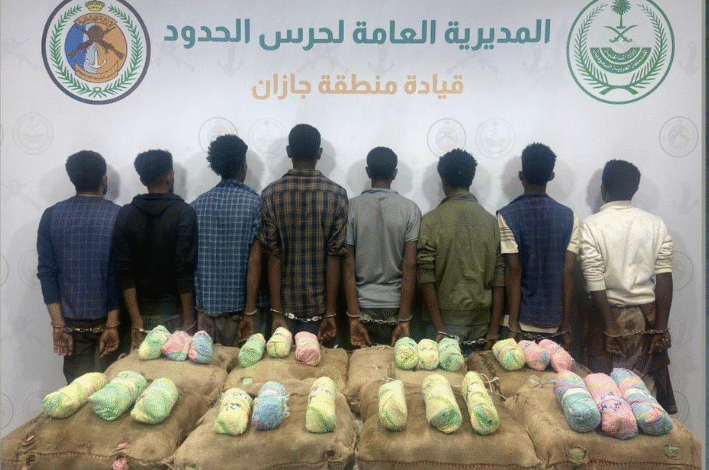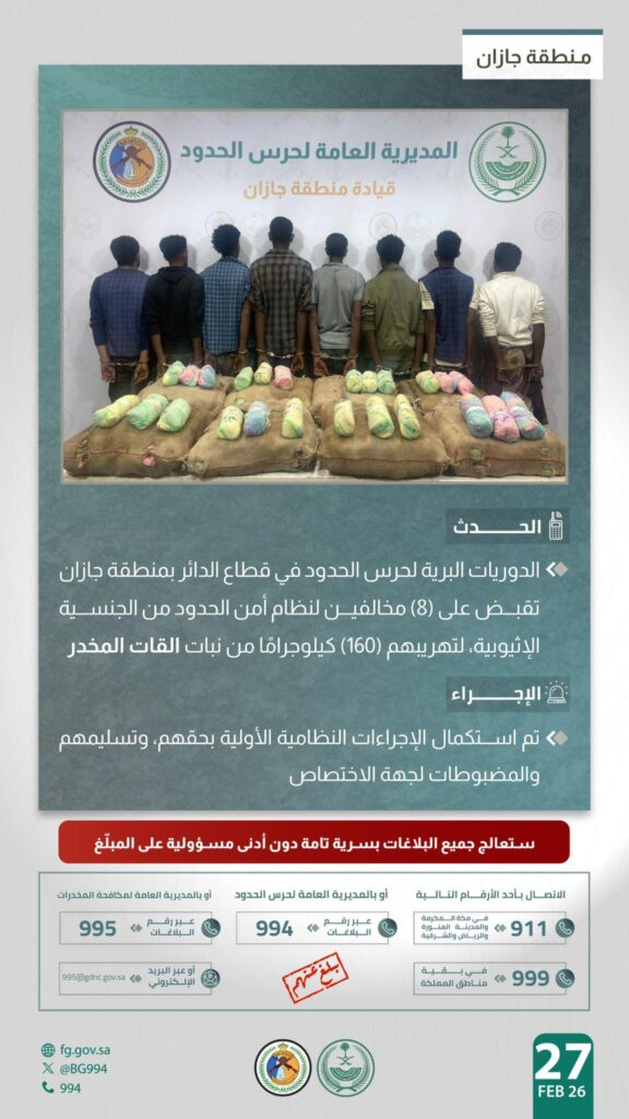 قبضت دوريات حرس الحدود البرية في قطاع الدائر بـمنطقة جازان على ثمانية (8) مخالفين لنظام أمن الحدود من الجنسية الإثيوبية، وذلك أثناء محاولتهم تهريب (160) كيلوجرامًا من نبات القات المخدر.