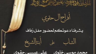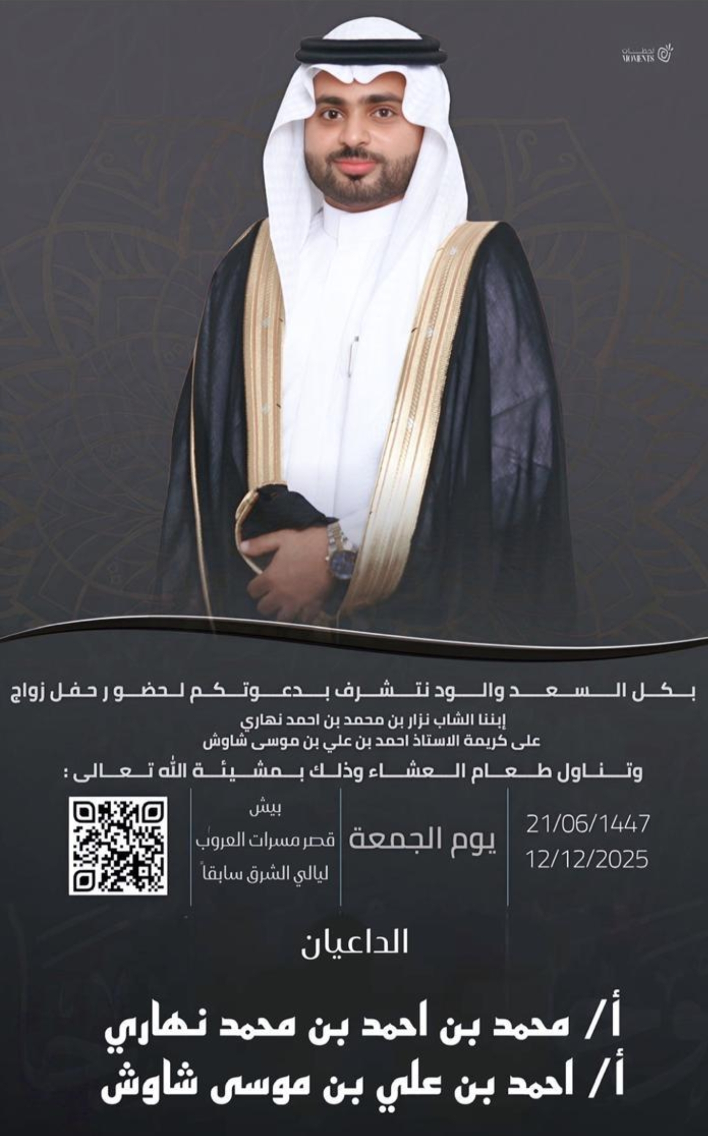 يتشرّف الأستاذ محمد بن أحمد محمد نهاري، والأستاذ أحمد بن علي موسى شاوش، بدعوتكم لحضور حفل زواج الشاب نزار بن محمد بن أحمد نهاري، وذلك يوم الجمعة 21/06/1447هـ الموافق 12/12/2025م في قصر مسرات العروب – بيش (ليالي الشرق سابقًا)، وتناول طعام العشاء بمشيئة الله تعالى.