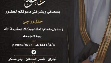 دعوة زواج الشاب نزار بن محمد النهاري في بيش يوم الجمعة القادم