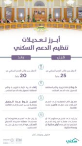 كشفت جريدة أم القرى، في عددها الأخير، تفاصيل قرار مجلس الوزراء، بالموافقة على تعديل بعض مواد تنظيم الدعم السكني، والتي كان من بينها خفض سن الاستحقاق لطالب الدعم، وإلغاء شرط الإعالة للمطلقة.