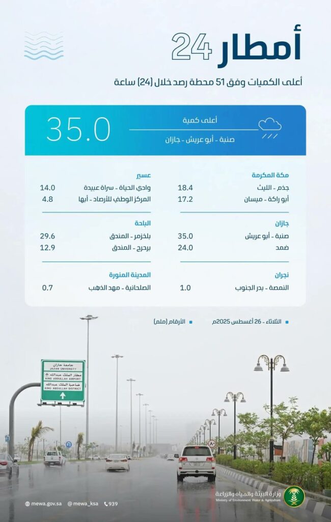 أعلنت وزارة البيئة والمياه والزراعة، يوم (26 أغسطس 2025)، عن تسجيل هطول أمطار متفاوتة الشدة على عدد من مناطق المملكة، وذلك بحسب ما رصدته 51 محطة متخصصة تابعة للمركز الوطني للأرصاد خلال الأربع والعشرين ساعة الماضية.