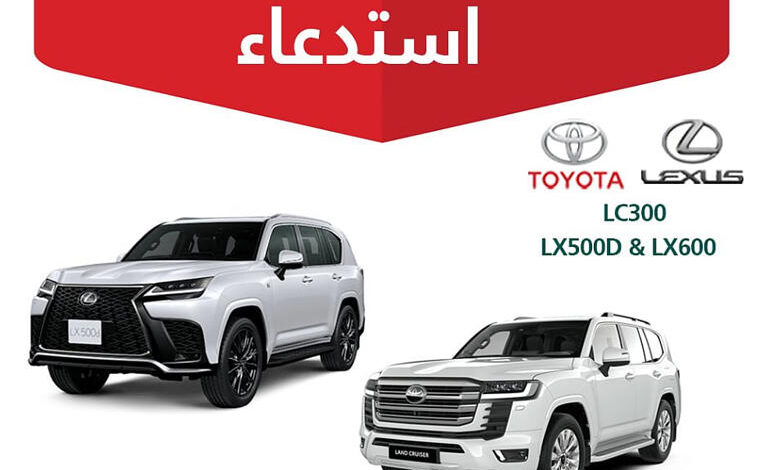 أعلنت وزارة التجارة عن استدعاء 19,281 مركبة من طرازات تويوتا «LC300» ولكزس «LX600 / LX500D»، موديلات 2022 – 2024، وذلك بسبب خلل فني قد يؤثر في سلامة المركبات أثناء القيادة.