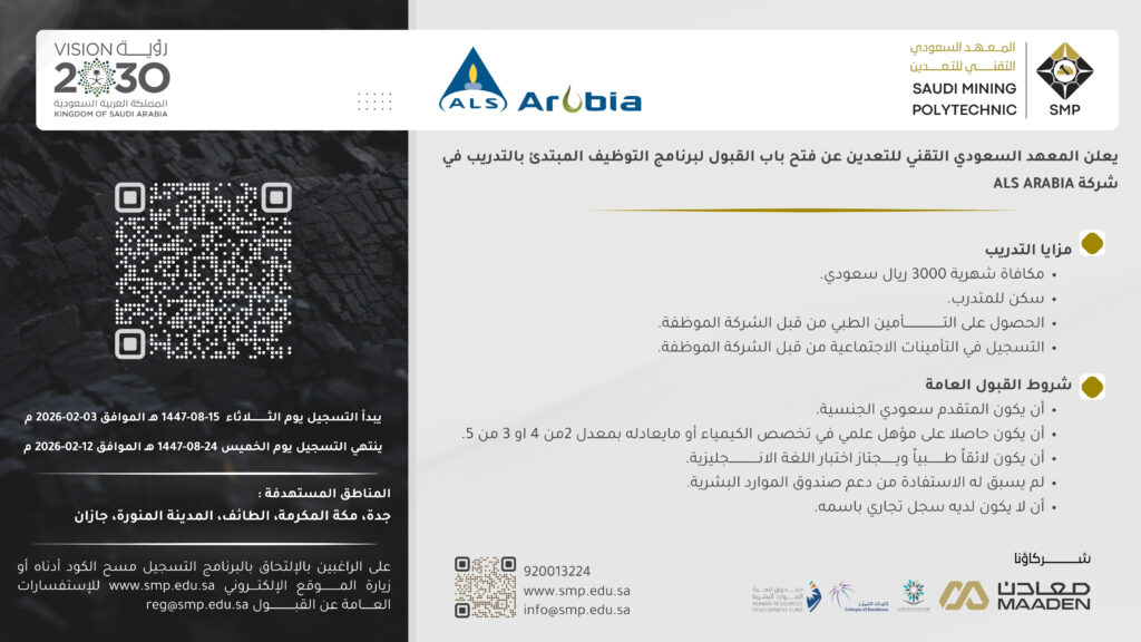 أعلن المعهد السعودي التقني للتعدين عن فتح باب القبول لبرنامج التوظيف المبتدئ بالتدريب بالتعاون مع شركة ALS Arabia، وذلك ضمن برامج التدريب المنتهي بالتوظيف الهادفة إلى تأهيل الكوادر الوطنية ورفع جاهزيتها لسوق العمل في قطاع التعدين.