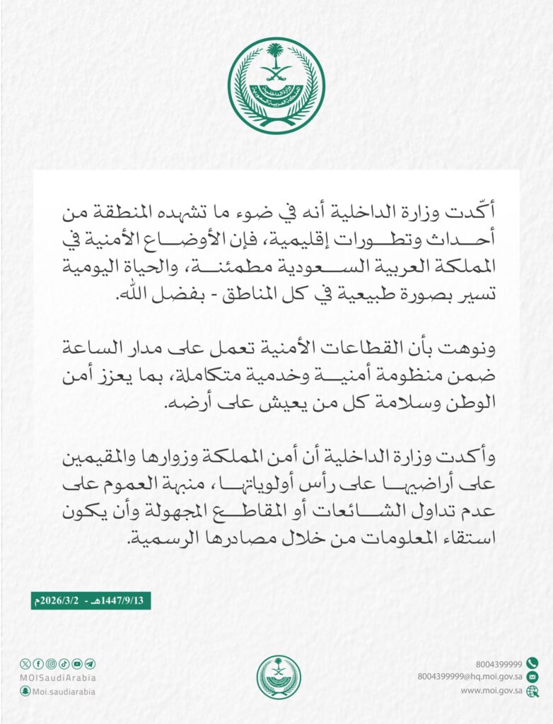 وشددت وزارة الداخلية على أن أمن المملكة، وزوارها، والمقيمين على أراضيها يأتي في مقدمة أولوياتها، منبهة إلى ضرورة عدم تداول الشائعات أو المقاطع المجهولة المصدر، والحرص على استقاء المعلومات من مصادرها الرسمية المعتمدة