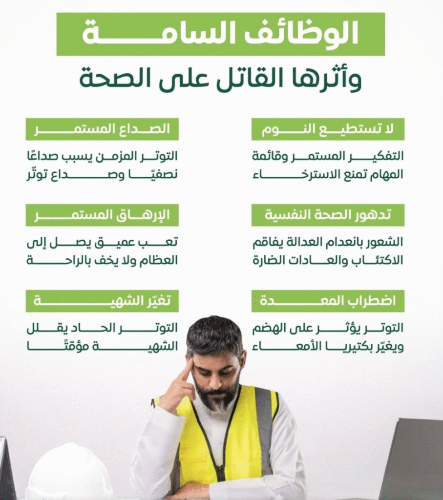 حذّر مختصون من خطورة ما يُعرف بـ«الوظائف السامة»، مؤكدين أنها تُعد من أبرز الأسباب المؤدية لتدهور الصحة الجسدية والنفسية لدى العاملين، نتيجة الضغوط المستمرة وبيئات العمل غير الصحية.